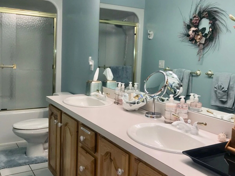 The private bathroom with shower, tub, double sinks  also comes with Aveda shampoo, conditioner, and soaps. Hair dryer and curling iron provided. We provide you with cozy robes to lounge in while you enjoy a movie in your room, or spend time on the Sunset Suite’s private deck which features colorful sunset views over Torch Lake.